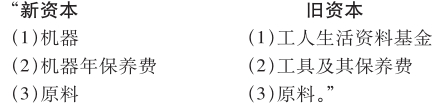 “李嘉图说,‘机器制造工人制造机器时耗费的劳动的一部分’,包含在例如一双袜子上。可是制造每一双袜子的全部劳动——如果我们说的是一双袜子——,包含机器制造工人的全部劳动,而不只是他的一部分劳动。因为,虽然一台机器织出许多双袜子,但是缺少机器的任何一部分,连一双袜子也织不出来。”(《评政治经济学上若干用语的争论》1821年伦敦版第54页,[Zh.13])
